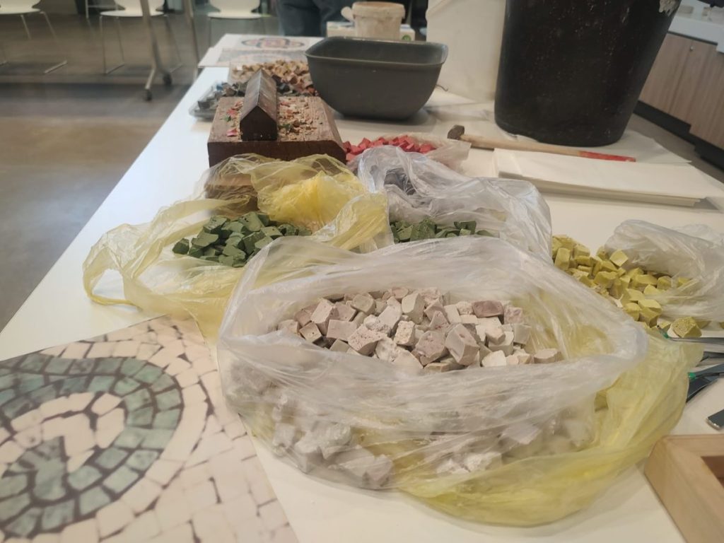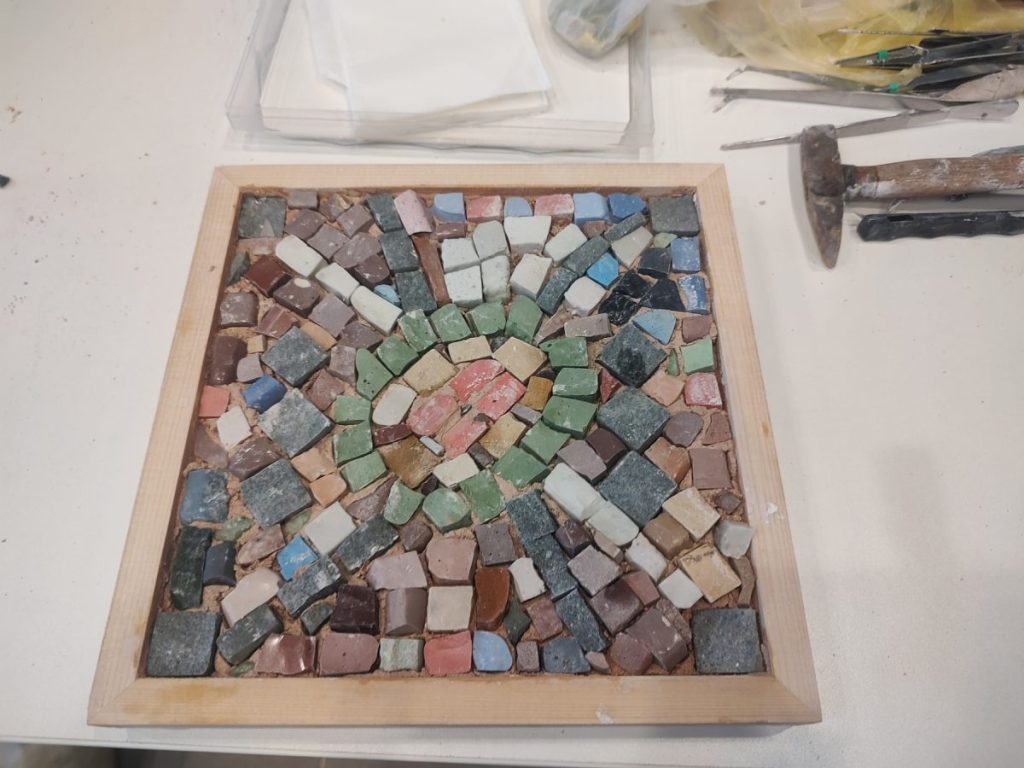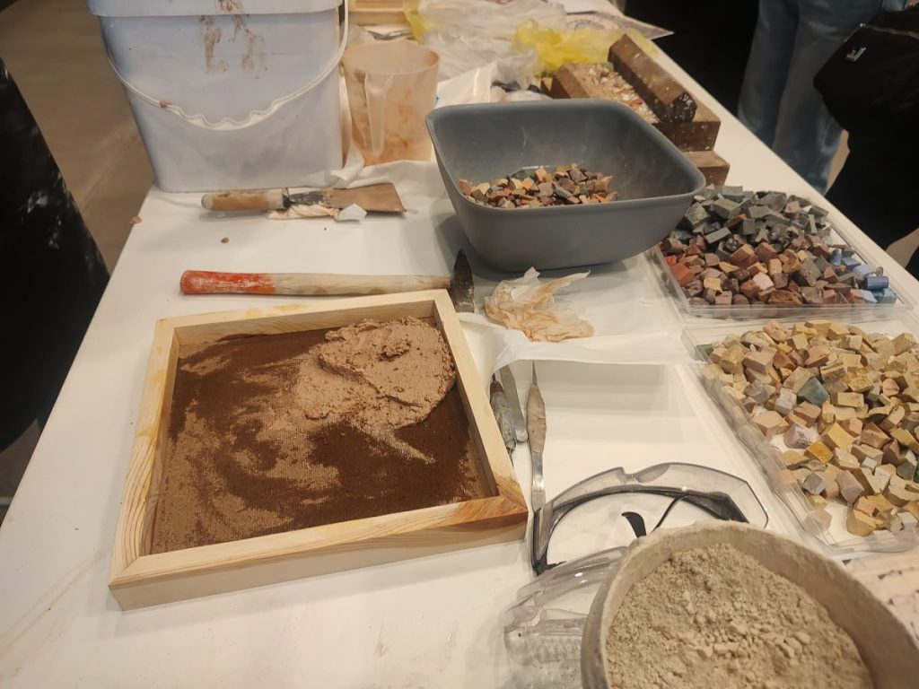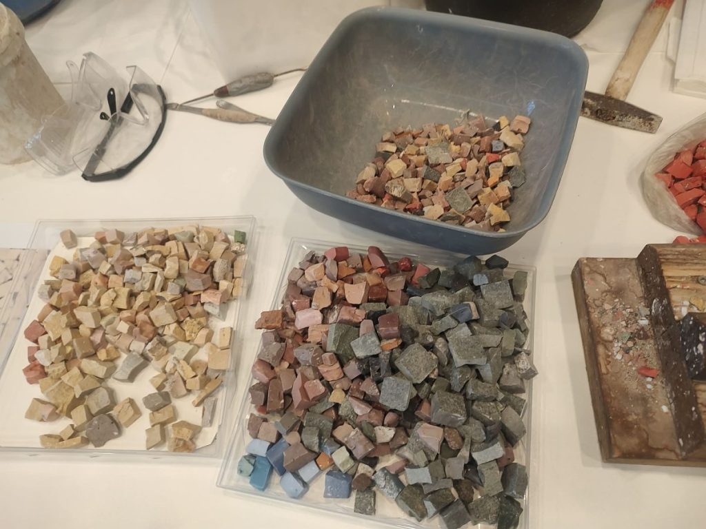 Пред погледа на участниците камъкът се превърна в тесери чрез прецизно ръчно сечене, а след това бе подготвено и хоросановото легло – основата, върху която постепенно се изгражда мозайката.