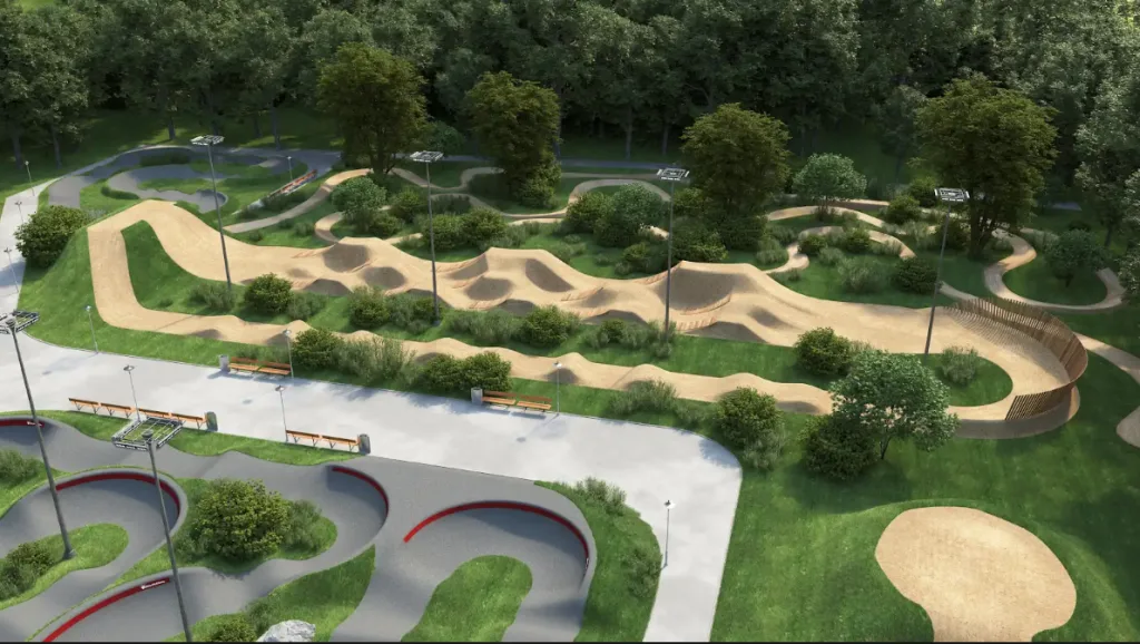 площ 1500 кв. м. трасе с разнообразни завои, бабуни и скокове, подходящо за широк спектър възрасти и умения. Проектът включва още детски “пъмп трак” с размери от 300-350 кв.м. – умалена версия на същия тип съоръжение, подходящо за най-малките колоездачи, стратегически позиционирано на входната точка на парка. Има още две зони с Фрийстайл съоръжения – за начинаещи и напредващи предлагаща две или три линии с различни по големина и дължина скокове за учене и развиване на уменията, тип тейбъл топ, изработени от импрегниран дървен материал и стабилизирана почва. Планирано е и изграждането на “Скил Зона” с естествени пътеки за развитие на умения – интегрирани в зелена среда естествени пътеки с разнообразни препядствия от планинското колоездене. В проекта са включени и изграждане на алейна мрежа, осветление, озеленяване и напоителна система, и кътове за отдих и други дейности