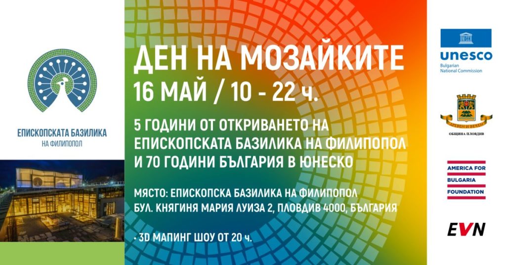 Епископската базилика на Филипопол ще бъде домакин на „Ден на мозайките“ – целодневно събитие с вход свободен, което ще отбележи пет години от откриването на обекта и 70 години от членството на България в ЮНЕСКО. Инициативата се организира с подкрепата на Фондация „Америка за България“, ОИ „Старинен Пловдив“, Община Пловдив и редица партньори.