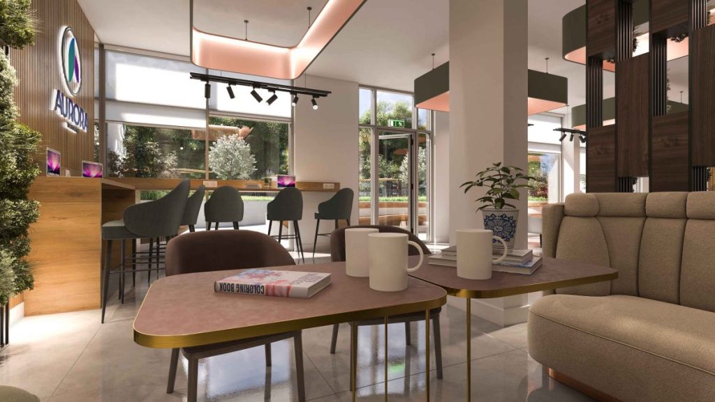Aurora Lounge, като пространство за социални контакти, е отражение на стремежът ни да създадем усещането в хората, че живеят „на правилното място“. Зоната има за цел да осигури комфорт и гъвкавост за различни ежедневни нужди. Лаунджът съчетава спокойна атмосфера, модерен дизайн и условия за събития, разговори и ежедневна свързаност между хората.