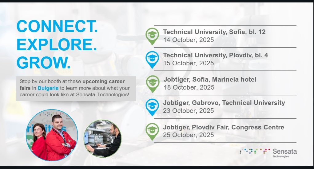 Sensata Technologies, световен лидер в областта на индустриалните технологии, с радост обявява участието си в поредица от кариерни събития в различни градове на България през месец октомври.