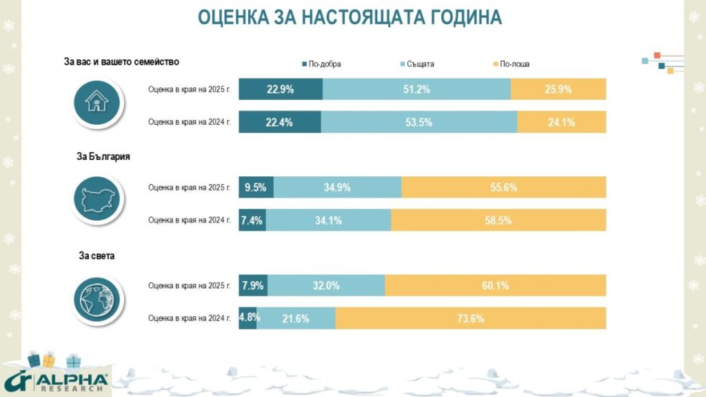 Очакванията за 2026 г. са по-негативни както в личен, така и в национален план. 45% от българите са песимисти за развитието на страната, като основните притеснения са свързани с инфлацията, растящите цени и несигурната политическа перспектива.