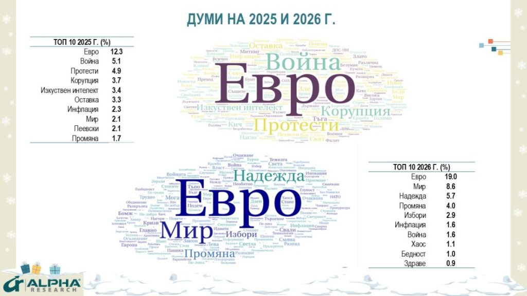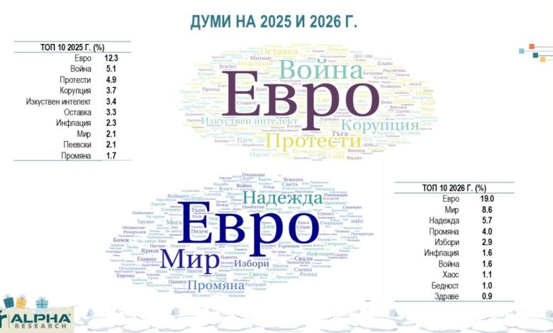 Характерните думи за 2025 г. са „евро“, „протести“, „корупция“ и „оставка“, докато за 2026 г. доминират „надежда“, „промяна“ и „избори“.
