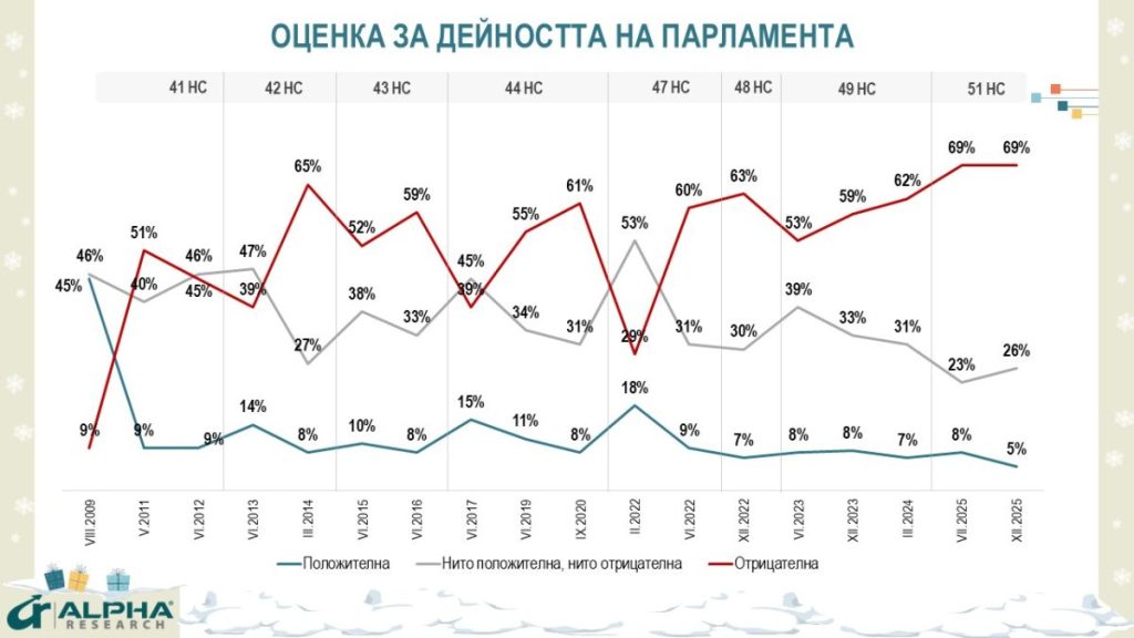 2025 година приключва с натрупано обществено напрежение, срив в доверието към институциите и дълбока криза в политическото лидерство. Това показват данните от национално представителното проучване „Обществено-политически нагласи“, проведено от агенция „Алфа Рисърч“ в периода 5–12 декември 2025 г. сред 1000 пълнолетни граждани в страната.