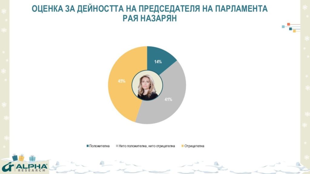 Правителството напуска управлението с 58% отрицателни оценки, а премиерът Росен Желязков – с 49% недоверие. Президентът Румен Радев запазва водещ институционален рейтинг, но и при него се отчита спад на доверието до 35%, на фона на нарастваща поляризация около позициите му за еврото и геополитиката.
