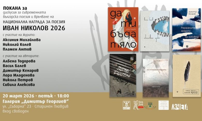 Националната награда за поезия „Иван Николов“ ще бъде връчена за 29-и път тази година на официална церемония в галерия „Димитър Георгиев“ в Стария град. Събитието ще се проведе на 20 март от 18:00 часа, а вратите за посетители ще отворят половин час по-рано.