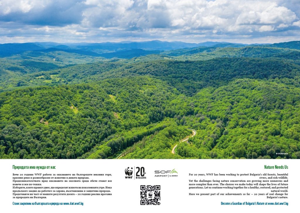 От 21 април до 12 юни излитащите от Терминал 2 на летище „Васил Левски“ – София ще могат да се насладят на красиви природни гледки още преди излитането. Изложбата „Природата има нужда от нас“ на WWF България ще облече в картини, думи и числа успехите на природозащитната организация през последните 20 години в защита на българските гори, реки, диви животни и защитени територии у нас.