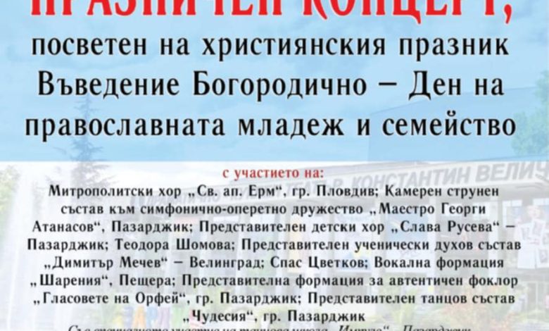 Пловдивския митрополит Николай кани от името на Митрополията на празничен концерт по случай християнския празник „Въведение Богородично – Ден на православната християнска младеж и семейство“. Концертът ще се състои на 21 ноември в Драматично-кукления театър „Константин Величков“ в Пазарджик, но безплатните покани се раздават единствено в митрополитския храм „Св. вмчца Марина“ в Пловдив. Така че, ако искате да присъствате и сте от Пазарджик, първо ще трябва да предприемете малко пътуване.