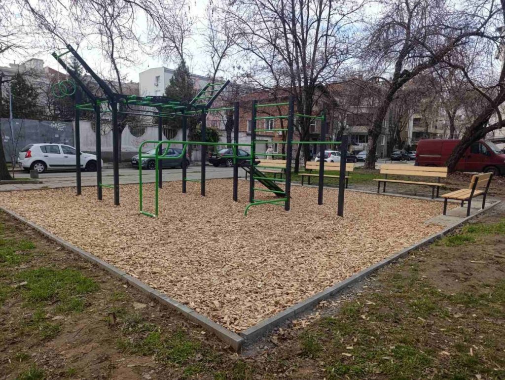 Площадките са оборудвани с комбинирани съоръжения за различни упражнения, а под тях е положен дървен чипс.