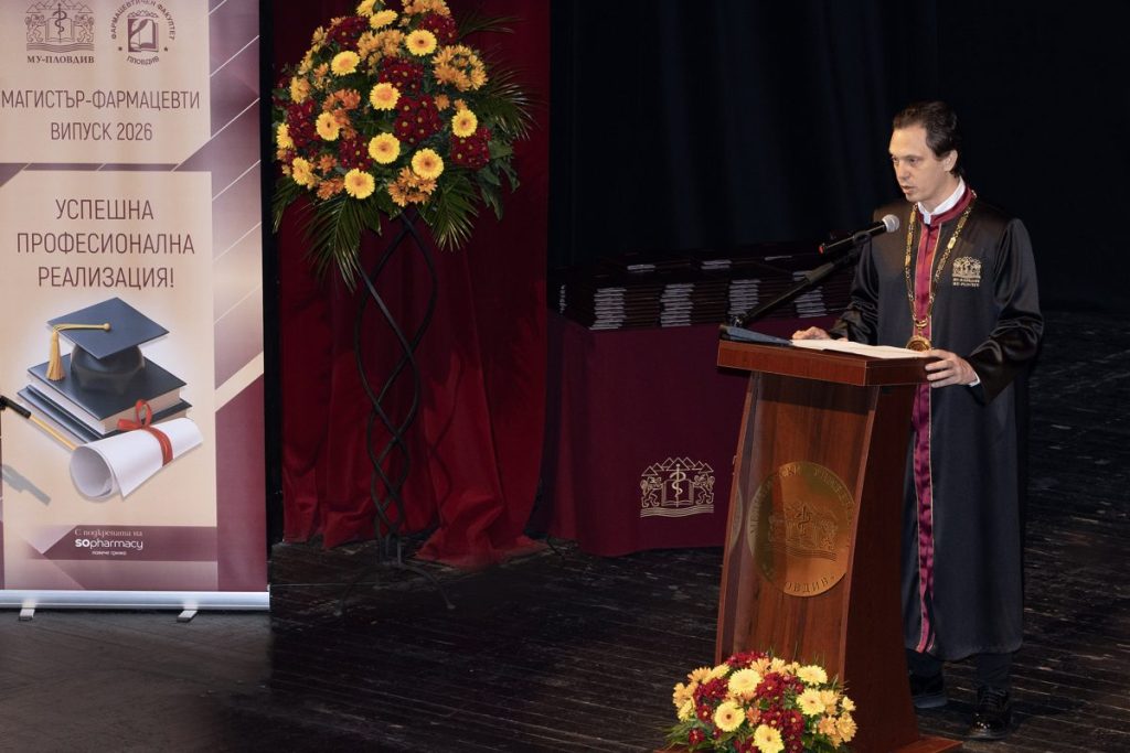 „В епоха на информационно изобилие и често противоречиви здравни послания, фармацевтът е надежден източник на знание и доверие за обществото. Вие ще бъдете хората, които насочват, обясняват и изграждат здравна култура. Вие сте мост между науката и пациента, между иновацията и практиката“, обърна се към дипломантите ректорът на Медицински университет – Пловдив проф. д-р Ангел Учиков и им пожела да бъдат почтени и отдадени на избраната професия, защото бъдещето на фармацията ще изисква адаптивност, критично мислене и готовност за учене през целия живот.