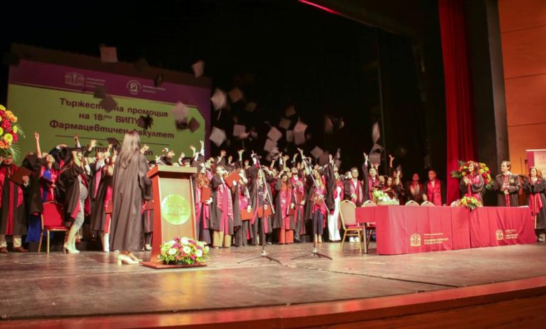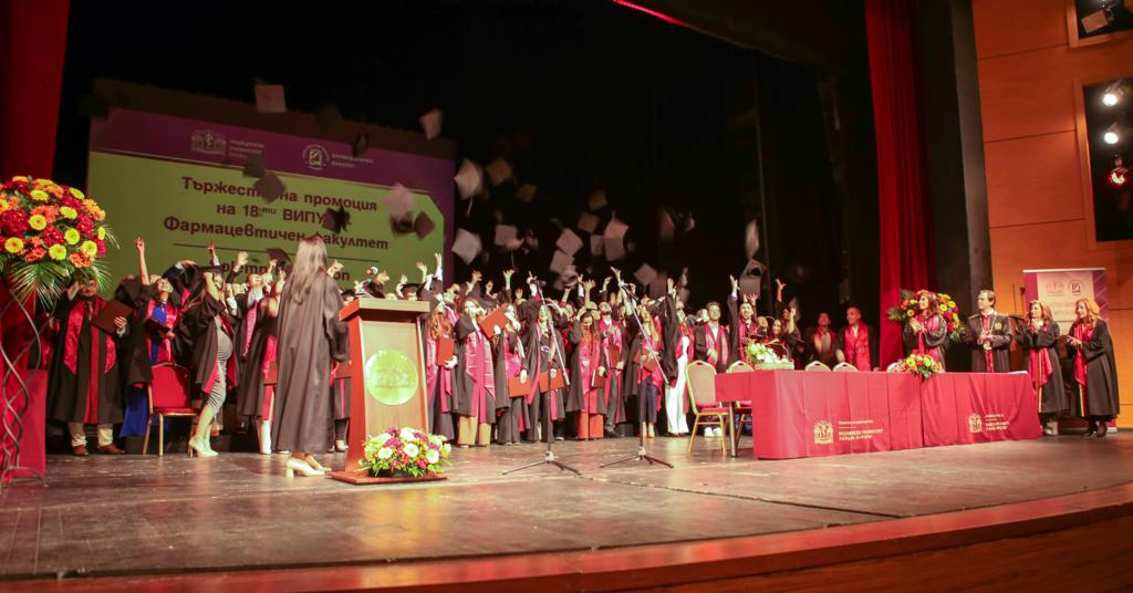 „Да бъда партньорът и консултантът на лекаря в назначаването на лечението и специалистът, който контролира безопасното прилагане на медикаментите“. Да посветят живота си в служба на здравето и хуманността обещаха днес абсолвентите от 18-ия випуск на Фармацевтичния факултет на тържествената промоция, която се състоя в Дома на културата „Борис Христов“. Дипломи за магистър-фармацевти получиха 97 студенти, 10 от които са чуждестранни от Гърция, Сърбия, Турция и Ливан.