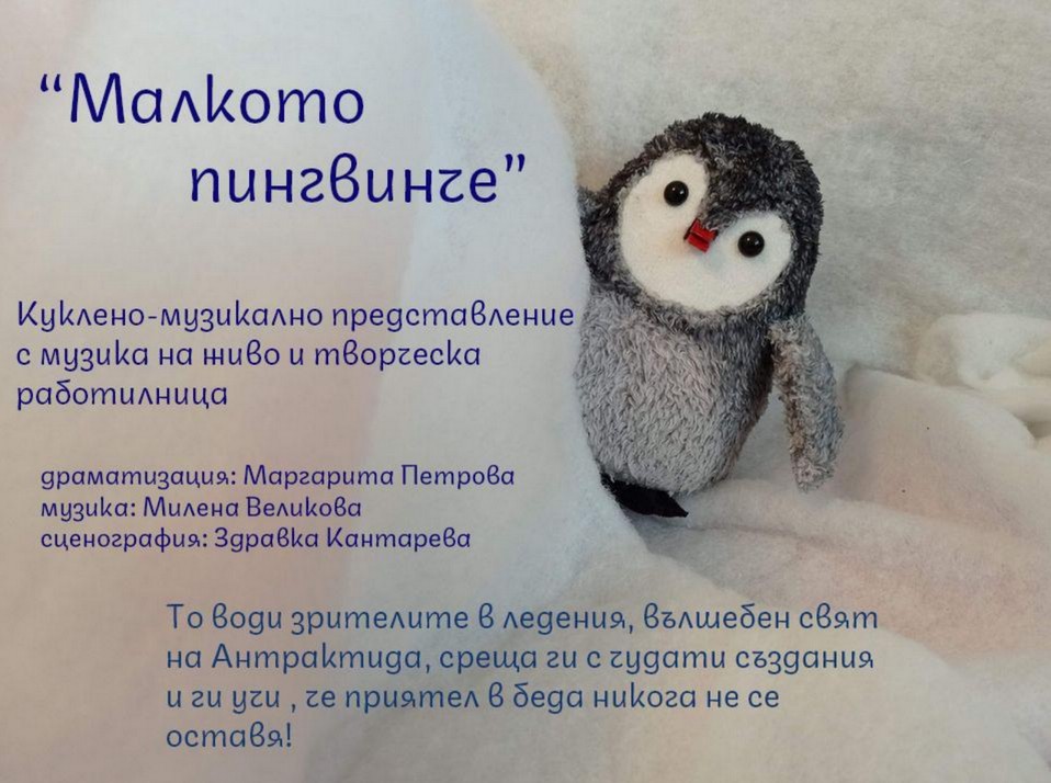 Кратко резюме: Артистите от Сдружение Приключения с кораб ще представят спектакъл “Малкото пингвинче”. Той е интерактивно куклено представление с музика на живо, предназначено за деца между 3 и 8 години. Малкото пингвинче и неговите приятели пътешестват из вълшебния свят на Антарктида. Те се срещат с чудати създания и разбират, че силата на приятелството помага във всяка беда. „Малкото пингвинче“ е пътуващо представление с творческа работилничка по текстове на обичаните детски истории за „Шестте пингвинчета“ и „Храброто пингвинче“.