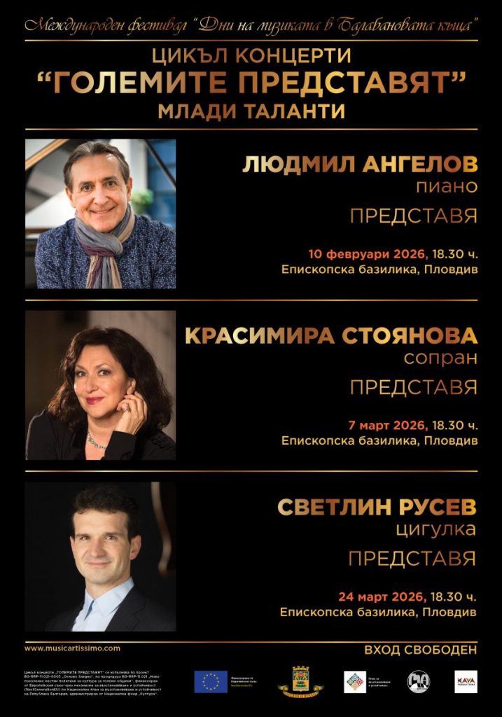 Цикълът концерти “ГОЛЕМИТЕ ПРЕДСТАВЯТ” в Международния фестивал “Дни на музиката в Балабановата къща” е закономерно продължение и в същото време значимо надграждане на създадения през 2017 г. от фондация Музикартисимо цикъл “КРАСИМИРА СТОЯНОВА ПРЕДСТАВЯ”. През 2026 г. той привлича трима именити български музиканти и педагози, разнасящи славата на България по света, с което се разраства и доразвива родената през 2017 г. в МФ “Дни на музиката в Балабановата къща” благородна инициатива.