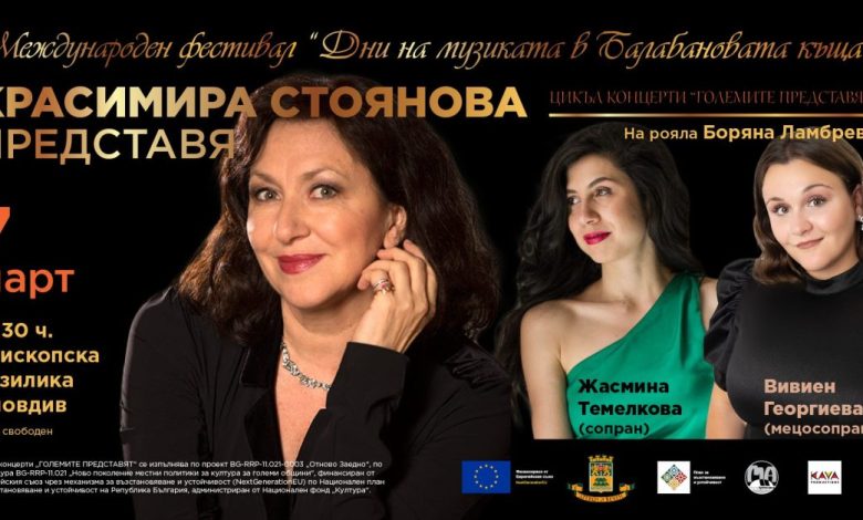 Световноизвестното сопрано Красимира Стоянова ще представи талантливите млади оперни певици Жасмина Темелкова и Вивиен Георгиев, като публиката в Пловдив ще има привилегията да се наслади и на изпълнение на самото звездно сопрано. На рояла ще бъде изтъкната пианистка и педагог професор Боряна Ламбрева – предпочитан и високоуважаван сценичен партньор на оперните певци. Концертът ще се състои на 7 март от 18.30 ч. на сцената на Епископската базилика под наслов “КРАСИМИРА СТОЯНОВА ПРЕДСТАВЯ” – част от цикъла „ГОЛЕМИТЕ ПРЕДСТАВЯТ“ в рамките на Международния фестивал „Дни на музиката в Балабановата къща“.