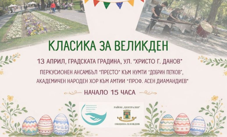 Традиционният празничен концерт „Класика за Великден“ ще зарадва пловдивчани и гостите на града на 13 април от 15 часа на открито в Градската градина на ул. „Христо Г. Данов“.