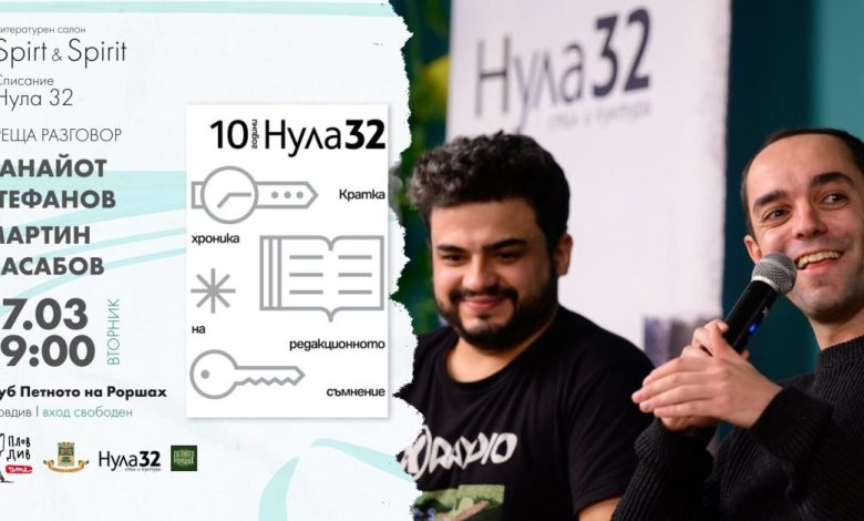 Среща-разговор с екипа на списание „Нула32“ ще се проведе на 17 март от 19:00 часа в клуб „Петното на Роршах“ в Пловдив. Събитието е част от програмата на Литературния фестивал „Пловдив чете“ и на инициативата Spirt & Spirit.
