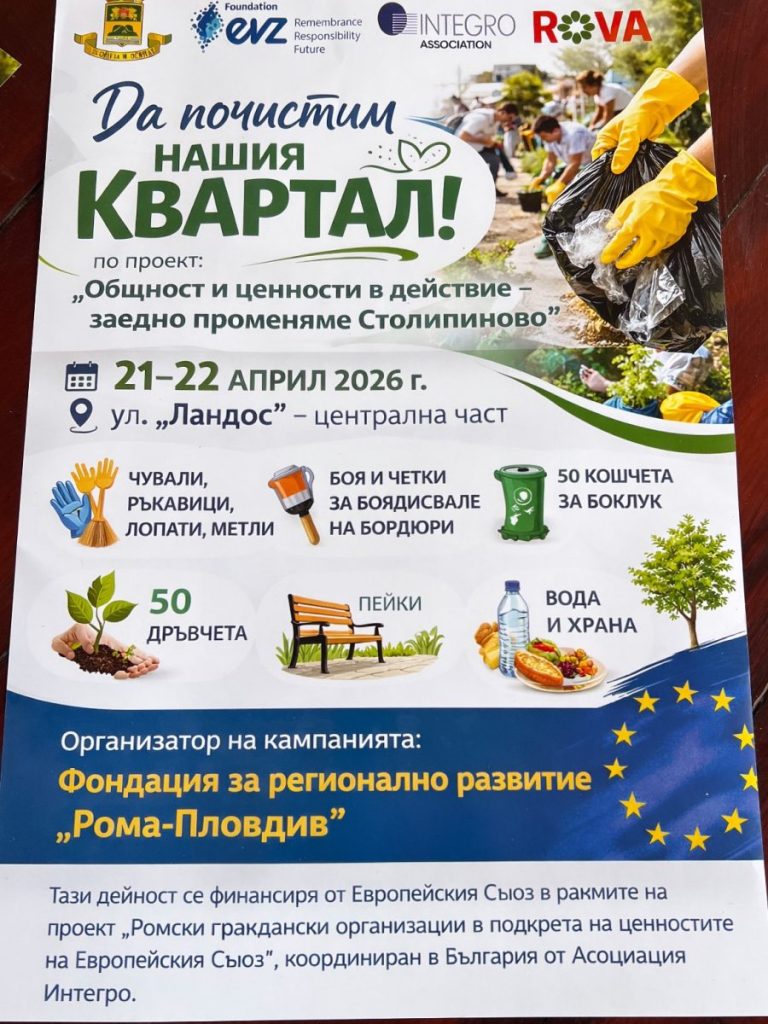 Кампания за почистване и облагородяване на централната част на бул. „Ландос“ в Столипиново тече на 21 и 22 април. Инициативата е на Фондация за регионално развитие „Рома“ – Пловдив и събира представители на местната общност и гости от чужбина.