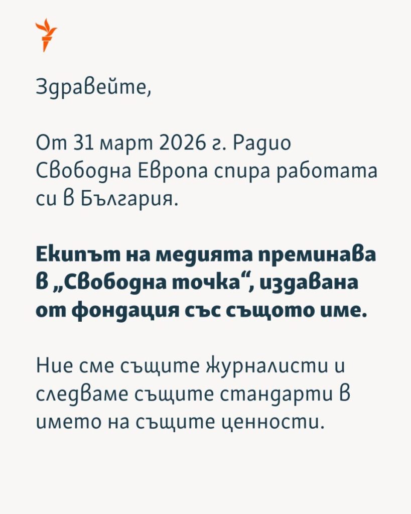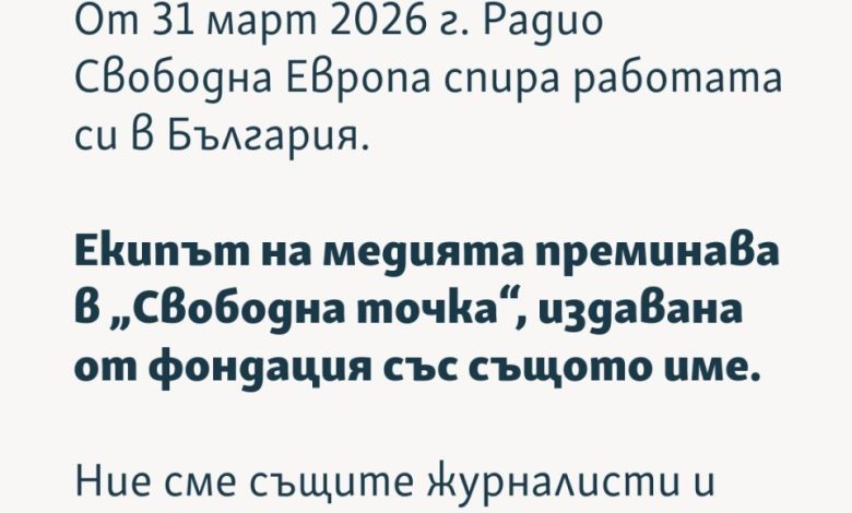 Българската редакция на Радио „Свободна Европа“ прекратява дейността си, като решението засяга още Румъния и Северна Македония. Причината е орязано финансиране на международната мрежа Radio Free Europe/Radio Liberty.