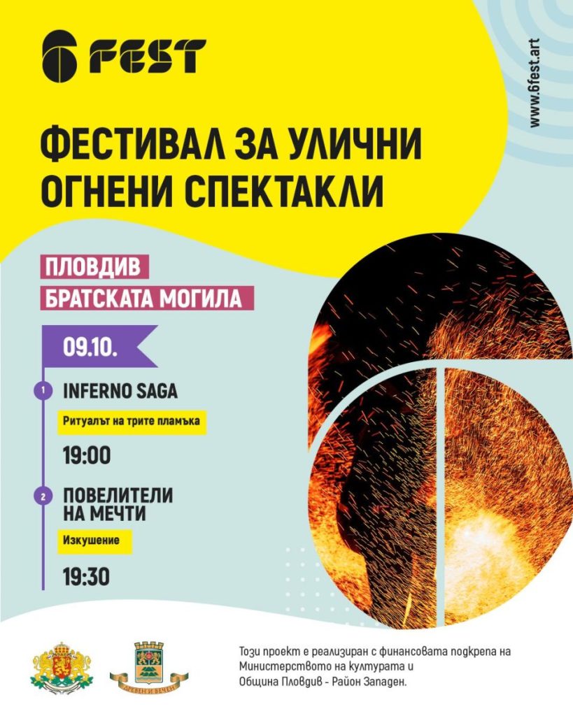 Фестивалът за улични изкуства 6Fest се завръща в Пловдив със специалния си фестивален формат, посветен на огненото изкуство – „Фестивал за улични огнени спектакли 6Fest 2025“. На площадното пространство пред Братската могила на 9 октомври (четвъртък) от 19:00 ч. ще гледаме огнения спектакъл „Ритуалът на трите пламъка“ на група „Inferno Saga“ (София).